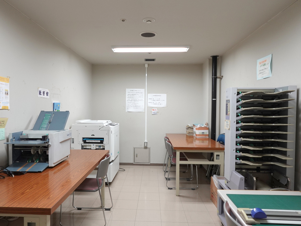 印刷機、紙折り機、製本機、丁合機、作業机などを備えています。市民活動に関する会報、チラシ、資料の印刷などに利用できます。用紙はご持参ください。